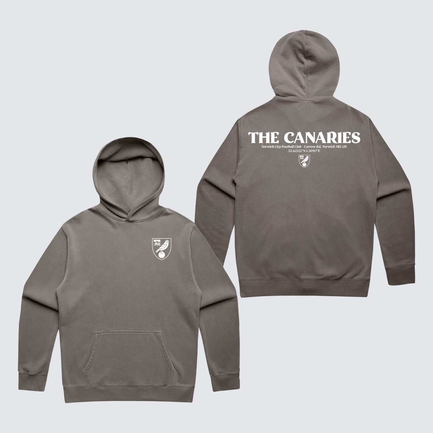 The front features a minimal Norwich City crest, keeping the look clean and understated. On the back, bold “The Canaries” lettering is paired with Carrow Road coordinates, paying tribute to the home of Norwich City Football Club. Finished in a timeless Faded Grey colourway with striking white detailing, this hoodie is a must-have for loyal supporters.