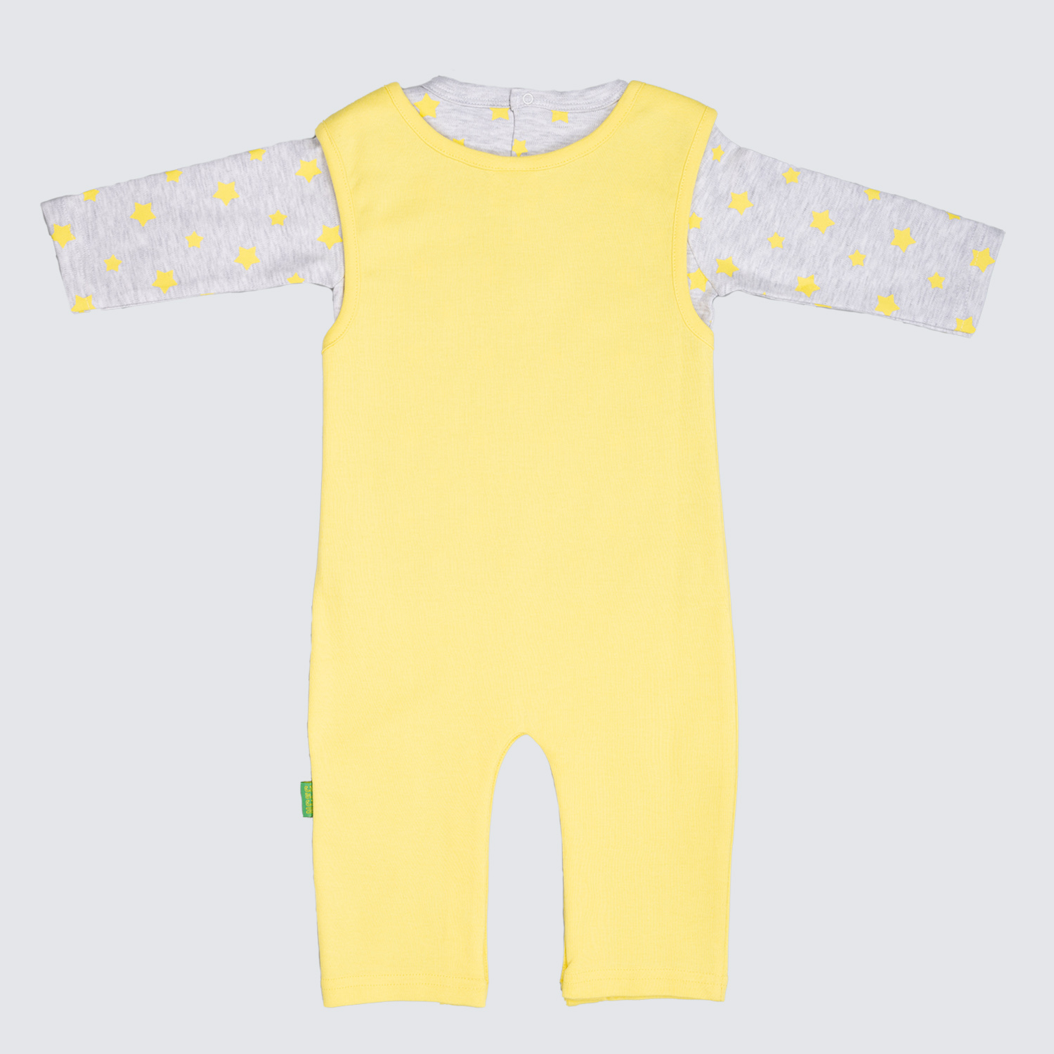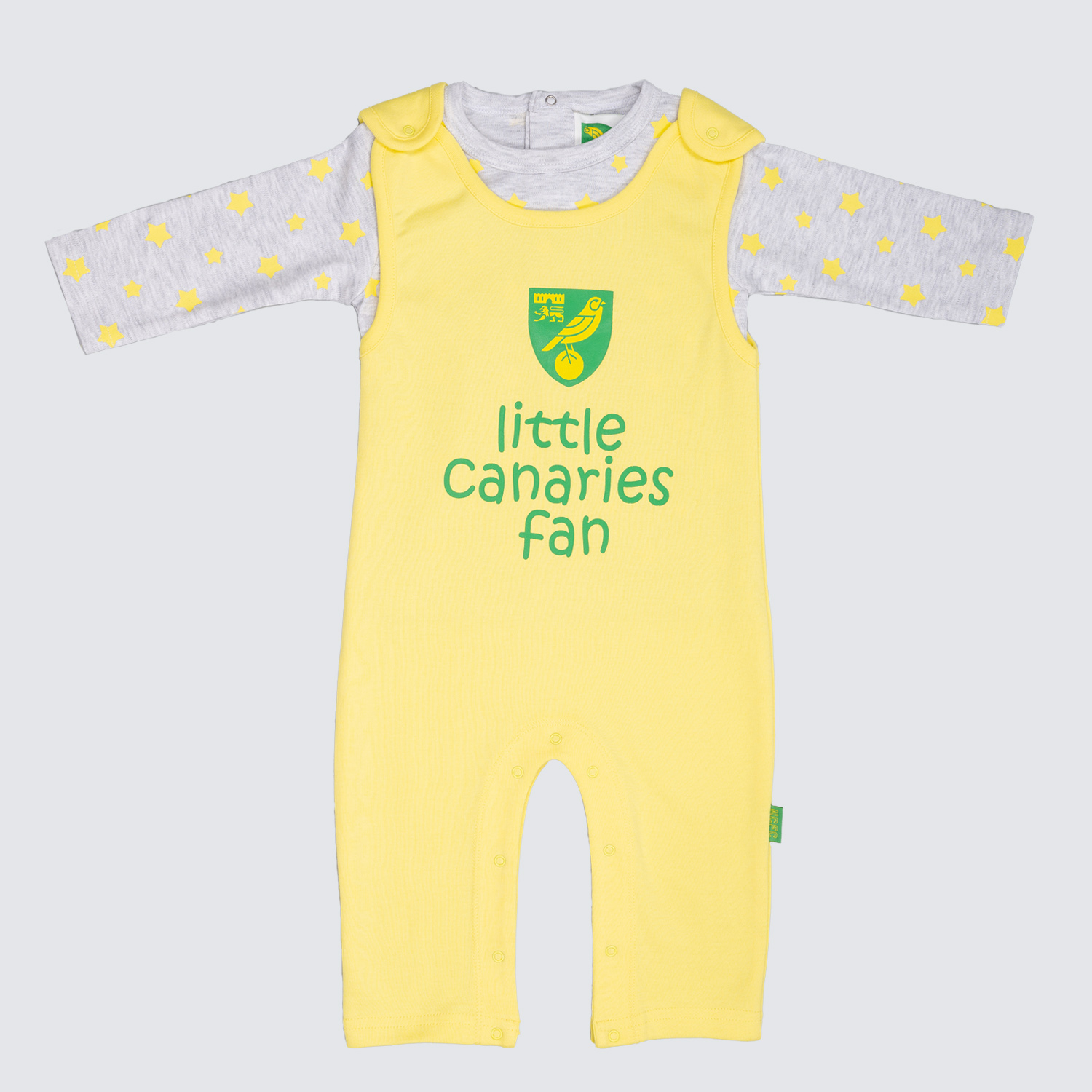 -Lemon yellow dungarees printed with full colour Club crest and 'Little Canaries Fan' text with popper fastening closure at shoulders and legs